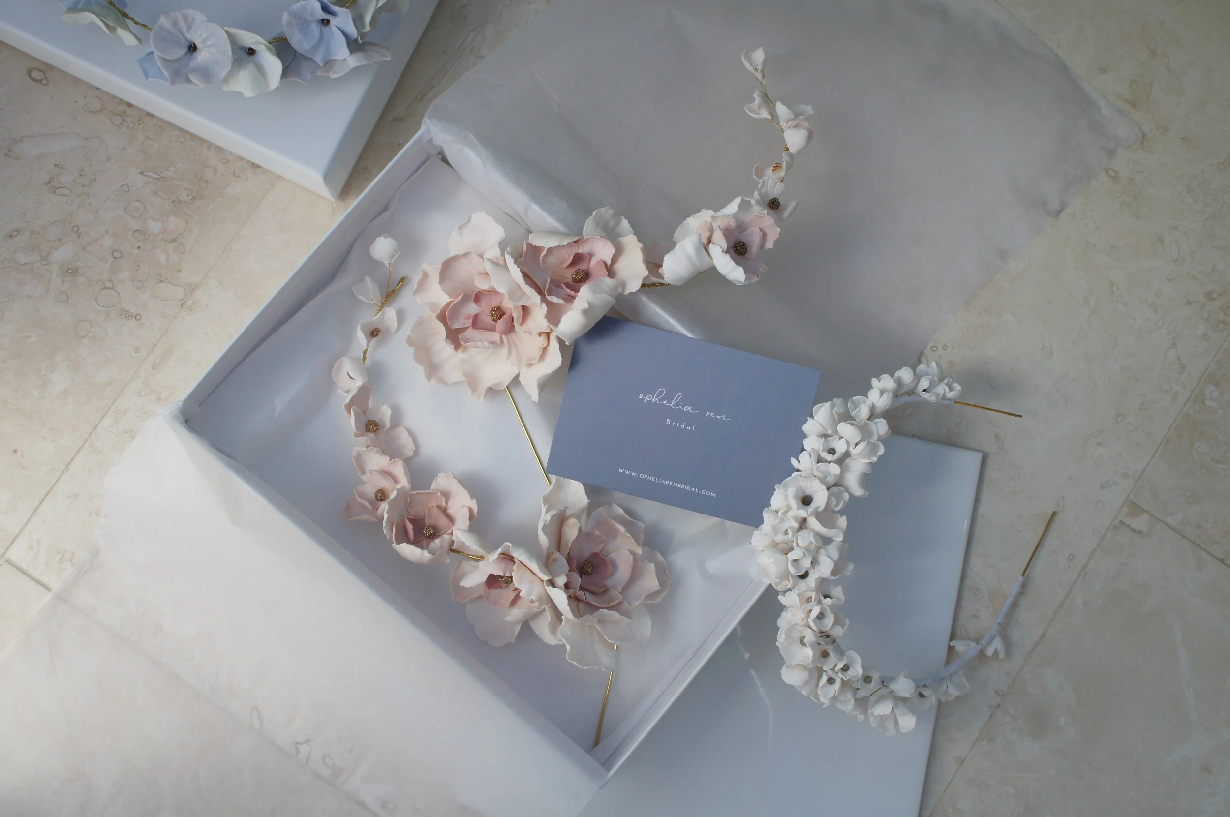 Once cured, I assemble the flowers into wearable forms—pins, crowns, vines, and earrings. I’m constantly thinking about weight, balance, and comfort. Many pieces include hidden loops or optional combs so they can be worn securely, with or without a veil.